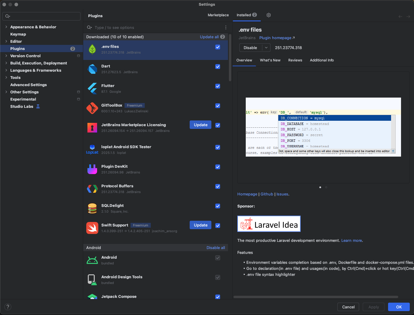 1. 안드로이드 스튜디오 설정 화면 이동, 좌측 리스트에서 plugin 선택