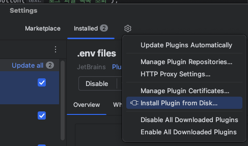 2. 톱니 바퀴를 눌러서 "Install Plugin from Disk" 선택