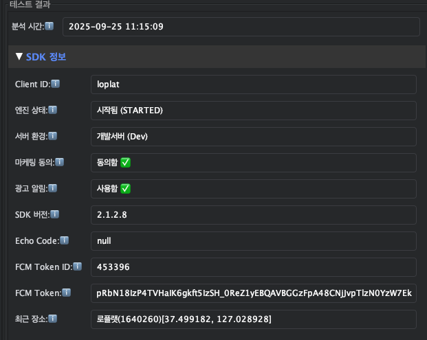 - 테스트 시작 버튼을 누르면 플러그인이 앱에 탑재된 SDK에 신호를 보내서 결과를 출력해줍니다.