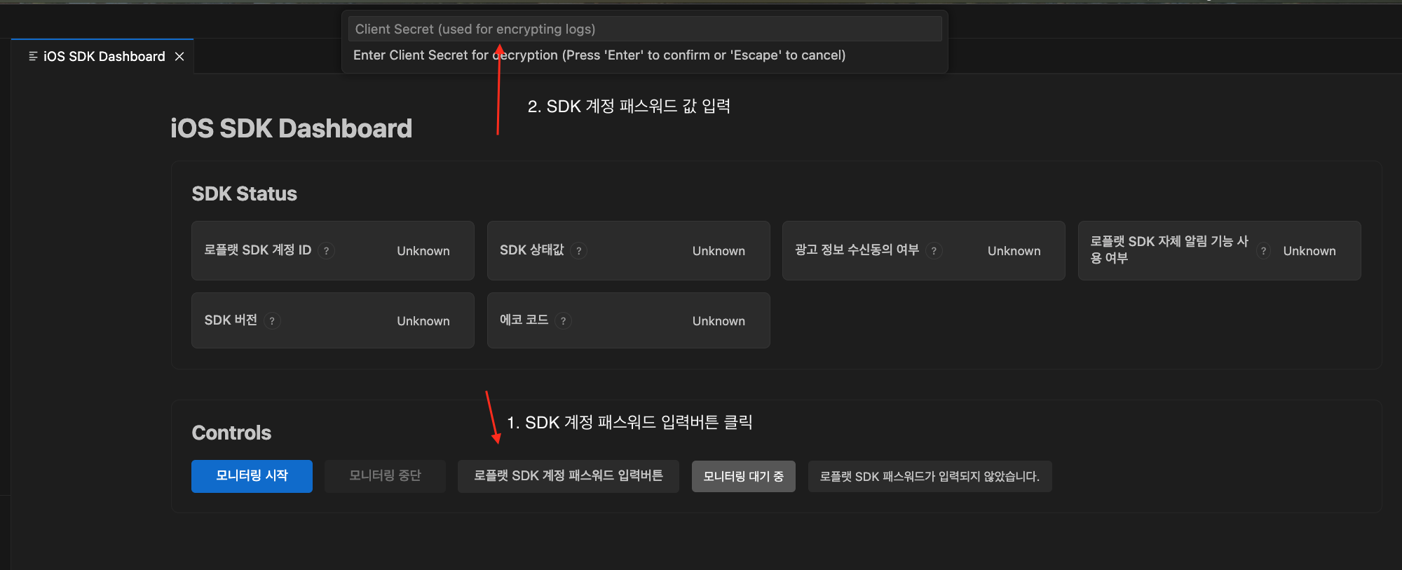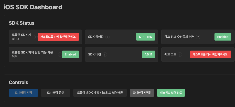 버튼을 클릭하여 상단에 노출되는 입력 폼에 SDK 탑재 시 초기에 발급받은 로플랫 SDK 계정 패스워드를 입력합니다.